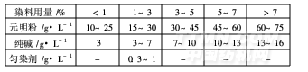 根据颜色深浅确定盐(元明粉)用量。一般浅色10~30g/L,中色40~70g/L,深色70~100g/L,可用Na2CO3、Na3PO4调节pH值至10~11。