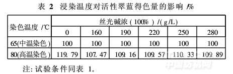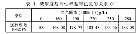 由表1可知,染色半制品经烧碱丝光处理,可以大幅度提高活性翠蓝的上染率,特别是经220 g/L以上烧碱(100% )“全丝光”处理,其相对上染率可提高80%以上。可见,丝光预处理是提高活性翠蓝上染率的关键措施。对棉织物进行丝光处理,碱浓应保持在220 g/L