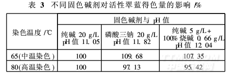 经检测,常用中温型活性染料的最佳固色pH值为10. 5~11. 0(活性翠蓝例外, 60℃染色其最佳pH值为12; 80℃染色最佳pH值为11)。生产中,常采用粉状轻质纯碱5~25 g/L, pH值约为11,其pH值缓冲能力很大。根据所染色泽的深浅,纯碱用量5~20 g/L。用量过多,得色深度提高不明显,反而会降低染料在盐碱固色浴中的溶解稳定性,降低染品质量。