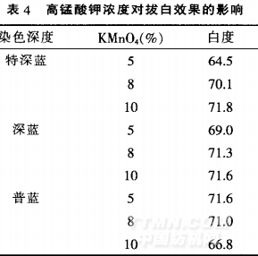由表4可知.随染色深度的增加.拔白浆中高锰酸钾的浓度提高则白度相应提高:染色深度较低时.高锰酸钾浓度提高.白度反而有所降低.这可能是高锰酸钾相对过量.残留的高锰酸钾要多消耗亚硫酸氢钠脱锰剂.导致脱锰不尽.引起泛黄