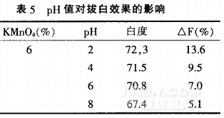 由表5可知.在酸性条件下.高锰酸钾的氧化性较中性或微碱性条件下强,随DH值的降低,白度有所增大。但强度损伤增加更快。因此,适宜的pH为4~8.但在中性或微碱性有利于延长拔白浆的适用期