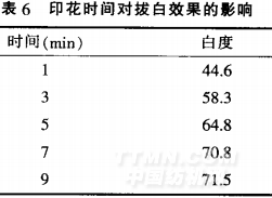 由表6可知.对牛仔坯布拔白印花后。随晾置时间延长,白度提高.表明延长晾置时间.有利于拔白浆的渗透.提高消色反应程度印花时间大于7min后.白度增加趋于缓慢