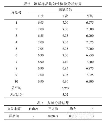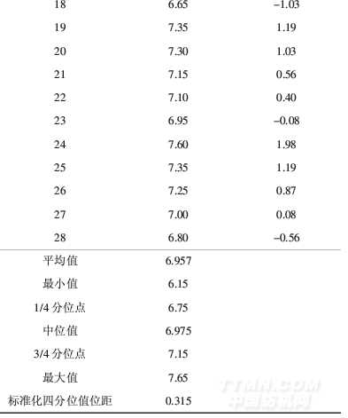实验室编号检测结果Z比分数算所得的F值为1.2.F<F0.05(9,10),表明在0.05显著