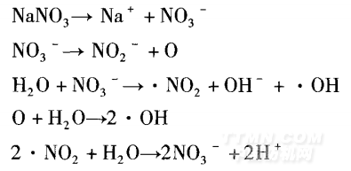 图3表明不同浓度硝酸钠对酸性棕ss的影响不是很明显,随着其浓度的提高有微弱上升的趋势。其可能原因是:硝酸根离子能接受电子,硝酸根离子吸收光后就会形成·NO2、·OH、NO2-,反应如下:
