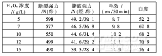 由表1知,随着H2O2用量增大,织物的断裂强力急剧下降, H2O2用量超过10g/L,断裂强力较低,不宜采用。综合各指标,选择H2O2用量为7~8g/L。