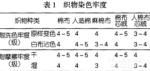 M型活性染料是由乙烯砜和一氯均三嗪构成的双活性基染料,可以克服活性基染料固色率低和染深色时易产生色差等缺点。由于两活性基团具有可补性,使该染料既耐酸又耐碱,给色深度可以达到直接染料水平而牢度明显优于直接染料。