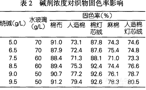 由表2可知采用烧碱与水玻璃混合碱剂,一方面保证染液有足够高pH值,使活性染料固色反应有足够快的速率;另一方面,由于水玻璃的缓冲作用,使染液pH相对稳定,提高了匀染效果。水玻璃用量大,缓冲能力大,固色率也增大。但水玻璃浓度过大,会增大染液粘度反而会降低固色率。因此,混合碱剂的用量一般可确定为烧碱5~]0g/L,水玻璃50~70g/L。