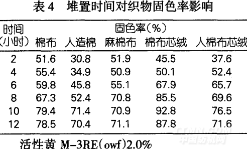 活性染料与纤维在碱剂作用下发生固色反应的同时,在织物毛细管内染料和在纤维内的染料还会发生一定程度的水解,固色反应基本完成后,如继续延长时间,起固色的染料越来越少,这时,纤维上已结合的染料发生水解。因此,不适当地延长固色时间,反而使织物的固色率下降。表4是堆置时间对织物固色率的影响,从表中可以看出,在30℃时用烧碱与硅酸钠混合,固色时间控制在l0小时左右为宜。