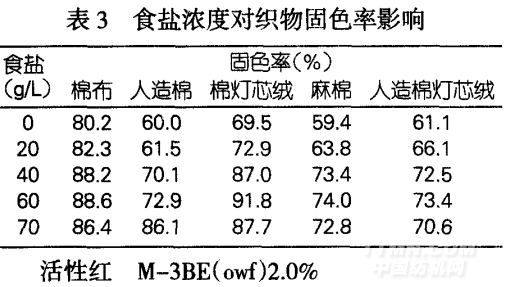 从表3中可以看出,织物固色率随食盐浓度增大而提高,但达到50g/L后,固色率反而有所下降。电解质加入可提高纤维内相的pH值,有利于固色反应。但食盐浓度过高,会使染料发生聚集或沉淀,对上染和固色反应都不利。因此,食盐用量一般确定为50g/L左右。