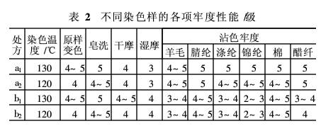 以130℃染色的涤纶双面布作为标准样,用Data-color测色仪测定K/S值,数据如表1所示。