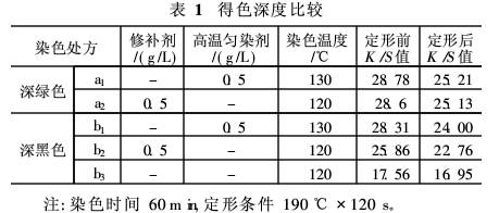 表1中, 120℃染色时加入修补剂后,染色深度可大大提高(约40% ),虽然仍较130℃为浅,但差距小于10%,因此,利用修补剂L提高高温分散染料120℃染色时的深度是可行的。定形后深度差异缩小,这是由于分散染料升华后附于织物表面而致。