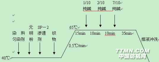 ③染色后处理: 70℃×10min水洗→90℃×15min皂洗→80℃×10min水洗→50℃×10min水洗→冷水冲洗→脱水(轧水)→烘干 ④纯碱用量比较: