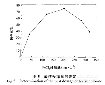 在皂土投加量为1 g/L,pH为7,反应温度为20℃,活性藏 青废水初始浓度为10 mg/L,体积为100 mL的条件下,考察三氯 化铁投加量对印染废水处理过程的影响,结果如图5所示。从图 5中可以看出,混凝对水样色度的去除效果非常明显。随着三氯 化铁投加量的增加,出水的吸光度不断变小,印染废水的色度去 除率不断增大。当三氯化铁投加量为200 mg/L时,CODc 去除率 达到最大值75.0%;此后随着三氯化铁投加量的继续增加,色度 去除率呈现缓慢下降的趋势。这是因为三氯化铁投加量的相对增 加使得水样中的Fe 增多,Fe 的颜色会影响水样的吸光度和去 除率。本实验表明,三氯化铁的适宜用量为200 mg/L左右。