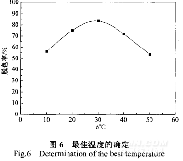 在三氯化铁投加量为200 mg/L,皂土投加量为1 g/L,pH为 7,活性藏青废水初始浓度为10 mg/L的条件下,考察混凝温度对 处理废水过程的影响,结果如图6所示。由图6可见反应温度由 10℃增高至50℃,色度的去除率逐渐增加,但增幅不大;温度 高于30℃后去除率反而下降。这可能是因为适当的温度可以加速 反应。温度升高,反应速度加快,使得去除率提高,但也会抑制 三氯化铁的作用,温度越高三氯化铁越难发挥作用,导致脱色率 下降J。本试验表明在10-50℃的较宽温度范围内脱色率能够达 到满意的降解效果,故本试验中温度控制在30℃左右,色度去除 率可达到86.3%。