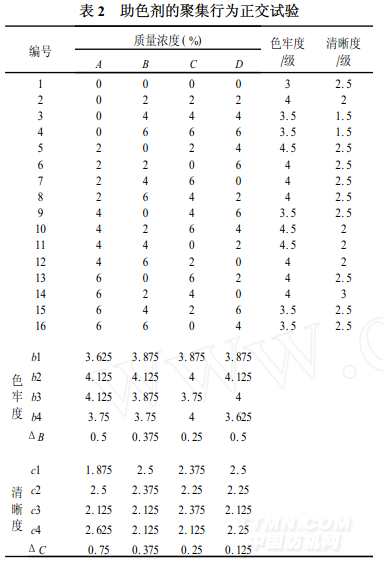 以上实验结果表明,在端基上带有—OH或—COOH的链状物质有助于增加分散染料与羊毛纤维之间的结合力。而—OH和—COOH之间能够产生分子间作用,形成一种聚集体。为了验证这种聚集对助色作用的影响,进行了正交试验。根据表1的结果,选用助色剂A、B、C、D进行正交试验,采用4水平4因子(即L16(44))正交表。试验方案及结果分析见表2。