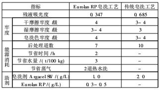 通过上述试验,得出EurolanRP较佳处理工艺为:EurolanRP用量0.4g/L,pH值5~7,85℃×20min。在该工艺下进行大生产,并与传统水洗工艺比较,见表7。