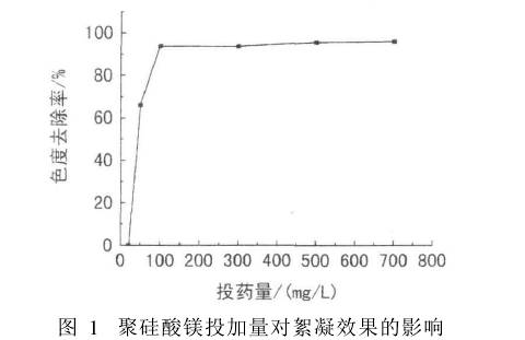 由图1知,单独加入粉煤灰或聚硅酸镁,处理效果不好。聚硅酸镁投药量为100 mg/L时,色度去除率达到93. 9%;继续加大投药量,色度去除率变化不明显。