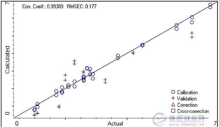 与棉含量参考值之间的分析模型。图3为建模样品预测值与参考值之间的相关图,图中横坐标为样品实际棉含量值、纵坐标为近红外预测值。其中相关系数(Corr.Coeff.)越高(最高为1),校正均方差(RMSEC)越低,表示近红外预测值与参考化学值越符合。