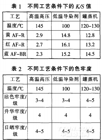 由表1和目测可知.低温导染剂工艺较罐蒸机工艺蒸化颜色艳丽.高温高压蒸化工艺相对二者较暗:低温导染剂工艺得色率与得色艳度均优于高温高压蒸化工艺幅宽、条长缩水率见表3。