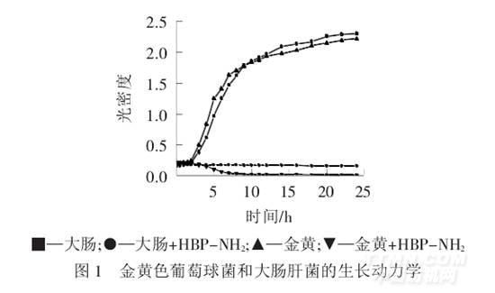 由图1 可以看出,在HBP-NH2存在下,金黄色葡萄球菌和大肠杆菌的生长受到明显的抑制作用,表明HBP-NH2水溶液具有很好的抗菌活性.