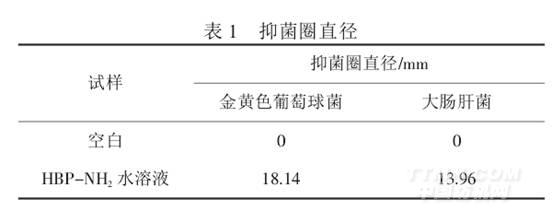 由表1 可知,空白样的抑菌圈直径均为0mm,HBP-NH2对金黄色葡萄球菌和大肠肝菌的抑菌圈直径分别达到了18.14 mm、13.96 mm,说明HBP-NH2水溶液对金黄色葡萄球菌和大肠肝菌具有优异的抗菌效果.