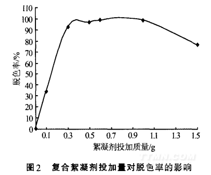 由图2可知.随着复合絮凝剂投加量的增加.脱色率随之上升。当复合絮凝剂投加质量达到0.5g时,脱色率接近100%,进一步增大投加量.脱色率没有明显变化,当投加质量增加到lg以上时.脱色率明显下降这是因为聚合氯化铝水解产物主要为Al(Ⅲ)多羟基络合物.可通过电中和使污染物颗粒或胶体双电层压缩、(电位降低从而迅速脱稳。最终发生凝聚并沉降下来。如果加人过量的聚合氯化铝,则污染物颗粒吸附过多的反离子.使所带电荷变号.相互排斥,产生再稳现象。综合考虑.合适的复合絮凝剂投加质量浓度为2.5g,L,下述实验均采用该投加量。
