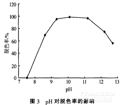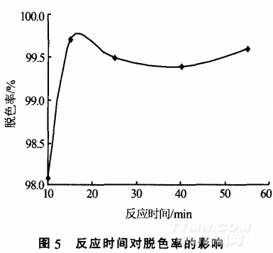 由图5可知.反应时间在20min左右时.脱色率达到最大.反应时间超过20min后脱色率略有下降.增加反应时间对处理效果几乎没有帮助。实验表明.该复合絮凝剂对活性艳红的吸附、絮凝和凝聚过程较迅速,这在实际水处理中是十分便利的。