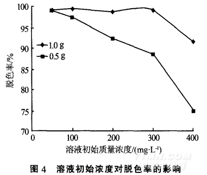 由图4可知.复合絮凝剂投加质量为0.5g时.随溶液初始浓度的增加.脱色率呈下降趋势:当投加质量为1.0g时,在溶液初始质量浓度<300mg/L的范围内均有95%以上的脱色率.溶液初始质量浓度超过300mg/L以后.脱色率显著下降。这说明单位质量絮凝剂存在一最大絮凝量.超过此范围处理效果下降。