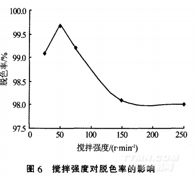 将0.5g复合絮凝剂投加到200mL质量浓度为100mv/L、pH为10的活性艳红溶液中.以不同的转速搅拌20min.静置1h后取上清液测其浓度。搅拌强度对处理效果的影响见图6