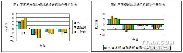 经水、酸性酶、中性酶处理,绿棉坯布都会产生色差,颜色向变深、变绿方向发展。相比之下,色差△E中性酶﹥酸性酶﹥水;中性酶的颜色更深、更绿。图6为复合酶处理绿棉机织物对色素的影响。机织物需要退浆,其色素的变化受到退浆条件的影响。图中可见,绿棉机织物几种方法退浆、精练后,坯布也都会产生色差,颜色向变深、变绿方向发展。相比之下,色差△E常规处理﹥酶退浆﹥中性酶﹥酸性酶﹥水。分析原因,绿棉色素对PH值敏感性较强,随PH 值从酸性向碱性过度颜色逐渐变深,变绿。通常精练方法PH值顺序:常规处理﹥酶退浆﹥中性酶﹥酸性酶,故色差顺序相同。水的PH 值一般为中性,其色差值小于酸性酶处理,原因在于酸性酶处理经历了退浆、酶处理两个步骤,综合结果酸性酶处理色差值大于水处理。一般酸性酶处理,颜色发黄,中性酶处理颜色偏绿且鲜艳。利用彩棉色素对PH敏感的特性,还可以在复合酶处理后对织物颜色进行修正,以解决碱处理颜色变得过深,或酸性酶处理颜色变得过浅、过黄的问题。3.7.2杂质残留率和吸水、抛光效果对比将绿棉针织物分别用酸性酶一浴法和中性酶一浴法精练处理,观察失重率、脂肪残留率率、果胶残留率和毛效、回潮率、起毛起球。脂肪残留率测定采用溶剂溶出法;果胶残留率测定采用分光光度法。试验结果见表6。 表6 不同处理方法杂质残留率对比| 坯布 | 酸性酶一浴法 | 中性酶一浴法 | |