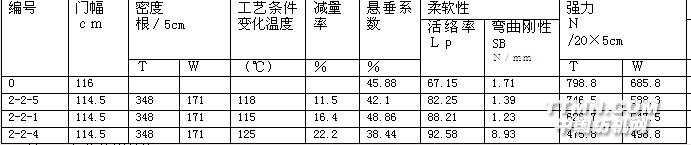 试验的减量率、悬垂系数、活络率、弯曲刚性强力等数据见(表一)。