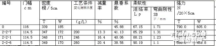 试验后测定减量率、悬垂系数、活络率、弯曲刚性、强力等数据见(表二)。
