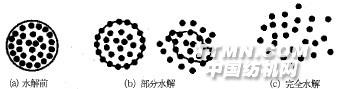 图1 海岛型超细纤维形成过程海岛型复合纤维由海组分和岛组分构成(图1)。岛组分最终形成超细纤维,通常为聚酯和聚酰胺;海组分是易水解聚酯(EHD—PET)或阳离子染料可染聚酯(CDP),可用碱水解的方法去除。因此海岛型复合纤维的碱减量目标是去除海组分、留下岛组分形成超细纤维。在加工中,当岛组分是聚酯时,要严格控制工艺条件。