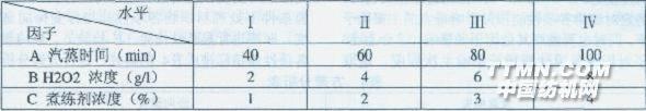 1实验 1.1实验材料 1.1.1化学品 H2O2、NaC03、Na3P04、NaOH(以上试剂均为CP级);水玻璃(工业品)、渗透剂JFC(工业品)、高效煮练剂ESA一864(自制)。 1.1.2织物 96×87 T/C细平布。织物翔榕见表1。表1织物规格指标