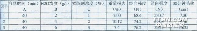 2.2试验方案与试验结果按表2的试验因子与水平,列出试验方案进行试验,将16次试验所得到的织物样品,测定其重量损失、毫细管效应、白摩、经向强度,列出表3。表3正交试验方案与试验结果.jpg)