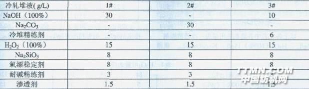 1试验 1.1试验材料与设备 1.1.1织物规格 40sx24s/1 26根/in.x67根/in.59in. 1.1.2染化料助剂 NaOH,H2O2,Na2Si03,Na2CO3,冷堆精练剂,渗透剂,氧漂稳定剂,螯合分散剂 1.1.3染整仪器设备 Datacolor SF600测色仪,Hounsfield H10KS拉伸强力仪,YGB毛效测试仪,Elmendorf撕破强力仪,SDL织物悬垂仪,平幅精练机,烧毛机,智能高温高压溢流染色机 1.2前处理工艺流程 平幅精练→冷轧堆→高效水洗→烧毛→漂白→中和(3g/L HAC,70℃x10min)→纤维素酶抛光→灭活(85℃x20min) 1.2.1冷轧堆工作液组成/(g/L)表1冷堆液配方工艺