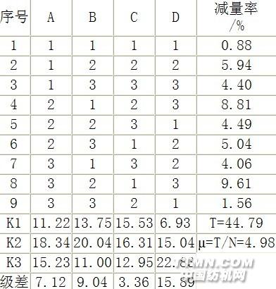 经Cu2+处理后H2O2预处理条件选择各因子水平如下: A——反应温度(℃) A1=40 A2=55 A3=70; B——H2O2(30%)浓度(ml/L) B1=10 B2=20 B3=40 C——反应pH值 C1=5.5 C2=7 C3=8.5; D——反应时间(min) D1=30 D2=60 D3=90 由极差数据:各因子对减量率的重要性依次为:D>B>A>C,即最重要的反应条件为时间,H2O2浓度次之,再有温度。可见,在相同酶处理条件下,减量率受H2O2反应中影响因素的主次顺序与影响二硫键减少的一致。即随着时间的延长和H2O2浓度的增加,Cu2+-羊毛催化H2O2分解生成HO.的量急剧增加,二硫键的量快速下降,减量率快速增加。因此进一步证明了预处理对蛋白酶催化水解羊毛的促进作用主要在于破坏二硫键。H2O2的氧化作用、氯剂的氧化作用、Na2SO3还原作用都会对胱氨酸的二硫键产生一定的破坏作用(反应如式3-1,3-2),有利于蛋白酶分子的进攻,这与前面的试验结果相符。氧化: