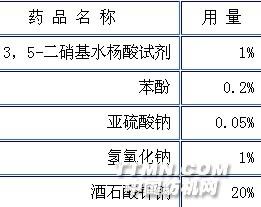 精确称取1 g 酶粉,用蒸馏水定容到200ml,配制5g/L的稀释酶液。 准备好新华1号滤纸条,规格:1cm Χ 6cm。 配备pH = 4.8的醋酸缓冲溶液。 按照下表配备3,5-二硝基水杨酸试剂(DNS试剂):