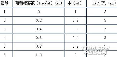 二 标准葡萄糖曲线绘制(吸光度值与葡萄糖含量线性回归)按下表1-1各取1 mg/ml标准葡萄糖液、3,5-二硝基水杨酸试剂(DNS试剂):表1-1