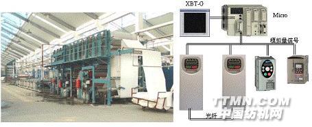 1. 引言 丝光工序是将煮练过的平幅织物在一定张力下,用浓碱溶液处理,使织物纤维发生不可逆的溶胀,纤维截面趋向圆形,表面光滑,再经冲洗去碱、蒸洗去净等加工,使织物产生丝一样的光泽,从而使织物获得稳定的尺寸、耐久的光泽、增加抗拉强度并提高对染料的吸附力。 丝光工艺使用的丝光机有布铗丝光机、直辊丝光机、弯辊丝光机等,其中应用比较普遍的是布铗丝光机,是由左、右两组布铗链条组成,织物在布铗夹持下进行冲洗去碱扩幅,幅宽容易控制,使织物获得较好的缩水率。 高速布铗丝光联合机和其它染整机械一样由进布装置、扎车、绷布辊、布铗式拉幅机(丝光机)、水洗机、烘燥机、出布装置等众多通用装置和单元机组成。其控制系统采用多单元交流变频调速,调幅、吸碱、喷淋、碱液回收用交流电机传动,探边、水洗机、上排导布辊用力矩电机传动,控制核心是对丝光机左、右两组布铗链独立传动,在速度跟随的同时实现位置同步,要求运转布速可达100m/min以上。整个系统采用10.4” Magelis XBT-G 彩色TFT触摸屏(XBT G5330)进行参数设定、显示等操作和系统监控。