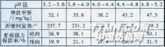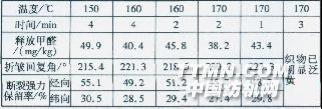 由表2可见,pH值越低,衬布释放甲醛量越少,折皱回复角越大,但断裂强力保留率也更低。根据质子催化理论,树脂整理液酸性越强,树脂与纤维分子形成共价键越多,未反应的树脂则越少,衬布释放甲醛量必然减少。由于树脂与纤维素大分子间共价交联反应充分,有利于提高衬布的折皱回复角,但强力下降也更严重。在衬布释放甲醛量和折皱回复角达标的前提下,要尽量降低衬布强力损伤,提高内在质量。另外,棉纤维不耐酸,在酸性条件下易水解使强力下降。平衡衬布释放甲醛量和断裂强力保留率,确定防皱整理工作液pH值为4.0~4.4。3.1.3焙烘温度和时间的影响 固定防皱整理剂、氯化镁和甲醛捕捉剂用量,树脂整理液pH值4.2,调整焙烘温度和时间,测定整理衬布性能见表3。表3焙烘温度和时间对整理衬布性能的影响