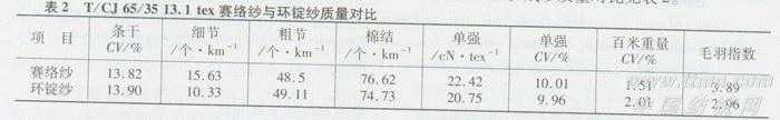 同细度的赛络纱与环锭纱相比,赛络纱单强高,百米重量CV小,毛羽减少,条干质量基本相当,细节多,粗节、棉结数量相当。