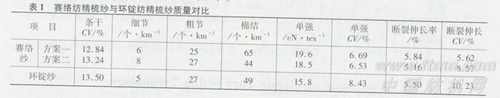 赛络纺CJ 14.5tex与环锭纺CJ 14.5 tex成纱质鼍对比见表1。
