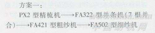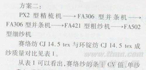 在改造过的细纱机上纺CJ 14.5 tex赛络纱,采用两种不同的纺纱工艺流程。
