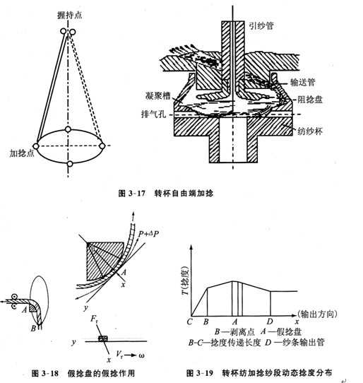 喂入条子被分梳辊分解成单纤维后,由转杯内负压和气流作用,在凝聚槽中形成环形纱尾,纤维环随转杯回转;当纱条从引纱管引出时,形成了以引纱罗拉为握持点、纤维环回转的自由端加捻,如图3—17所示。