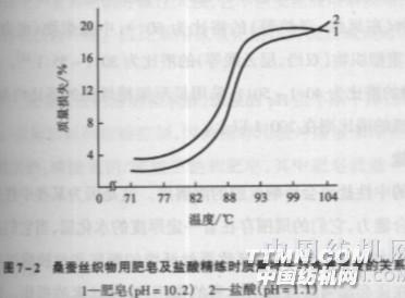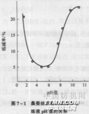 (一)练液的pH值 pH值为4~7时(丝胶等电点附近),练减率最低 当pH>9或pH<2.5时,丝胶溶解度显著增加 在练液pH值过高(11以上)或过低(2以下),会使蚕丝纤维的强力显著下降 可选用pH值为1.75~2.5酸性溶液或pH值为9~10.5的碱性溶液中精练 由于酸浴精练不能除去脂蜡等杂质使成品手感粗糙发硬,且对设备腐蚀严重,故采用弱碱性溶液中精练