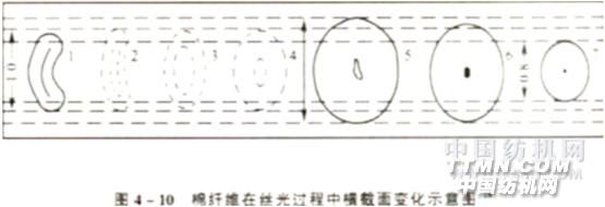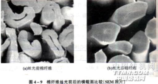 1-5:纤维在碱液中继续溶胀 6:溶胀后再浸入水中开始发生收缩 7:完全干燥后棉纤维在浓碱液中逐步发生溶胀,若再经过水洗和干燥,直径会缩小一些,长度也会有所增长,但不能回复到原来状态若要达到钡值150的处理效果,只需要170g/L的浓度即可,但考虑到光泽和棉布本身吸附一定的烧碱量,生产中采用260~280g/L
