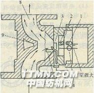 采用折射法连续测量工艺过程中溶液的折光率,便可换算成溶液浓度 (1)光电浓度变送器 光电浓度变送器是应用光学原理制成的,当光线经过两种物质界面时要发生折射或反射,仪表应用临界角,使光线反射在光电池上,接收光随着溶液浓度变化而变化,光电池输出的mV信号经毫伏转换器,转换成DC统一的1~10mA信号。浓度测量范围为10%~50%,读数单位也可用g/L或波美度(°Bé)表示。 ①测量头 测量头由光源、棱镜、光电池组成,并设计有冷却水槽。当被测溶液温度高于60℃时,测量头应通水冷却方可使用。被测溶液浓度高、黏性大,应注意对测量棱镜进行清洗。安装测量头时,应防止剧烈振动。 ②采样管道 图3—37是YB—Z-7自动折光仪的采样管道结构示意。工艺碱液进入采样管道8,受湍流板9阻挡产生湍流,其目的是使取样准确,避免在光学棱镜区域形成盲点,工艺溶液对测量棱镜能产生一定的冲刷作用,镜头上无泡沫、茸毛、棉屑等滞留,确保准确取样,维护方便,法兰上有4个φ11mm螺孔,由4个M10螺钉把测量头和管道连接起来。 测量头、采样管应垂直安装在最高液位上,避免沉淀物覆盖测量棱镜。