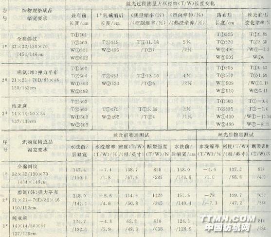 ①指由日本山东铁工所生产的丝光机,下同。 注:1.织物l# 40×40/133×72纯棉府绸;2# 32×32/13