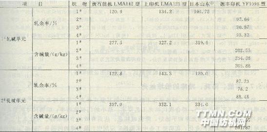 ①1#织物落布后.T值变化:T①0.8%,T②3.38%,与去碱水洗段的经向张力有关,尤其是“松紧架”初始张力的加大,T②落布长度将略增长。 ②1#织物W值变化,W①-2.2%,W②0%,W①与布铗扩幅值有关,而w②则与T②的伸长有关。 ③测量缩率1#织物11.18%,控制缩率7%,是为了纬纱从“环曲”状态经拉幅到“挺直”状态时,要通过“经纱”作为“环卷”的变形,因此,进入布铗拉幅前经向保持一定的收缩率,将有利于纬向的扩幅;亦可减小丝光工艺落布织物经向的伸长率。 ④棉氧(纬)禅力布的门幅:下织机后门幅收缩到一个平衡点的下机门幅;退浆后纱线捻度降低,门幅收缩后的退浆门幅;高温定形后的定形门幅;柔软蓬松处理摩擦力捻度进一步减小,经拉幅至成品门幅。丝光工艺对棉氨(纬)弹力织物幅宽不起决定作用,而影响织物幅宽的主要因素是氨纶丝的收缩作用。2#织物丝光前w水洗缩率-4.6%,丝光后W水洗缩率-7.3%,这与两者水洗前△W:151.6-148=3.6(cm)有关。 ⑤3#织物丝光落布门幅比成品门幅窄,这与布铗拉幅宽度有关:前逆退煮漂半制品的加工定量关联很大;1#轧碱上轧点压力过大,下轧点压力偏低,将影响它的透芯及充分溶胀,将有阻于拉幅;热烧碱预洗的效果将影响到拉幅的宽度。 (2)碱液轧余率对比 表3—76系松堆丝光机与三种紧式丝光机烧碱轧余率的对比。 表3-76烧碱轧余率对比